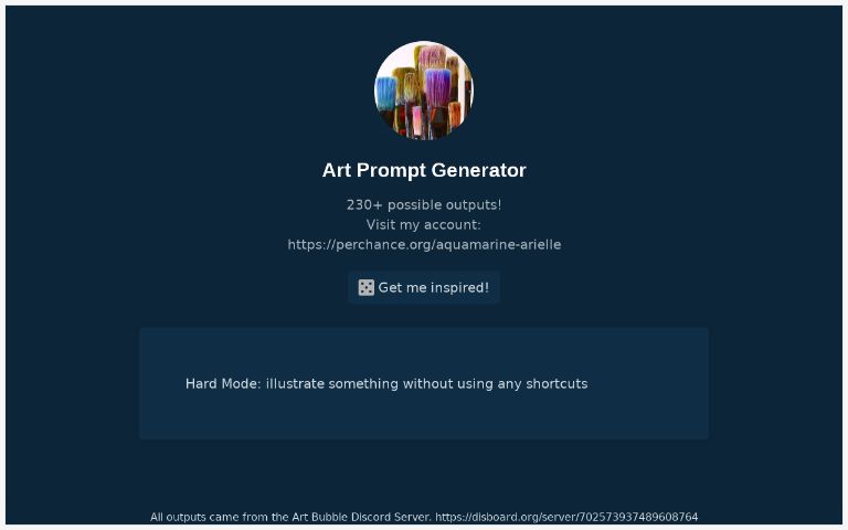This art prompt generator enables you to randomly instantly generate ideas for art inspiration. It does not link to any of my other generators which are not kid-friendly. 15 September 2018 NEW KID-FRIENDLY ART PROMPT GENERATOR.